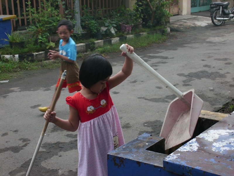 Haiiii…. kenalin, namaku Iza… Aku hobi membersihkan halaman rumah.