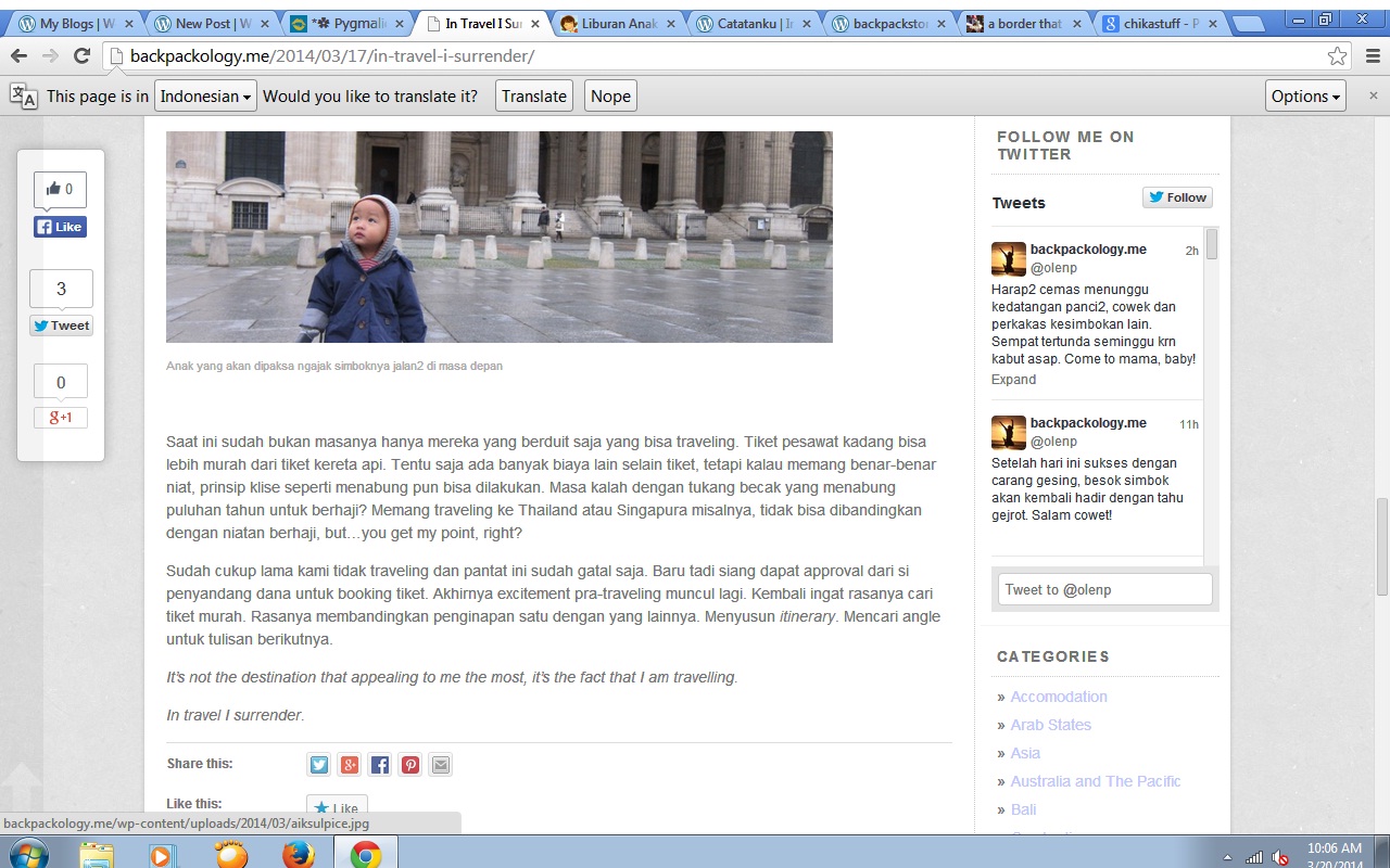 Cintaaaaa banget ama http://backpackology.me/. Dibesut *tsaaah* oleh emak2 yang menakjubkan bernama Olenka! Bisa ngajak dedek bayinya ke luar negeri sejak umur,kalo ga salah, setahun-an gitu deh. Ya ampun, aku aja ngajak anakku ke Pacitan udah setengah mati sutrisnya! Olenka dan suaminya emang ‘midas’ banget lah. Love this family so much!