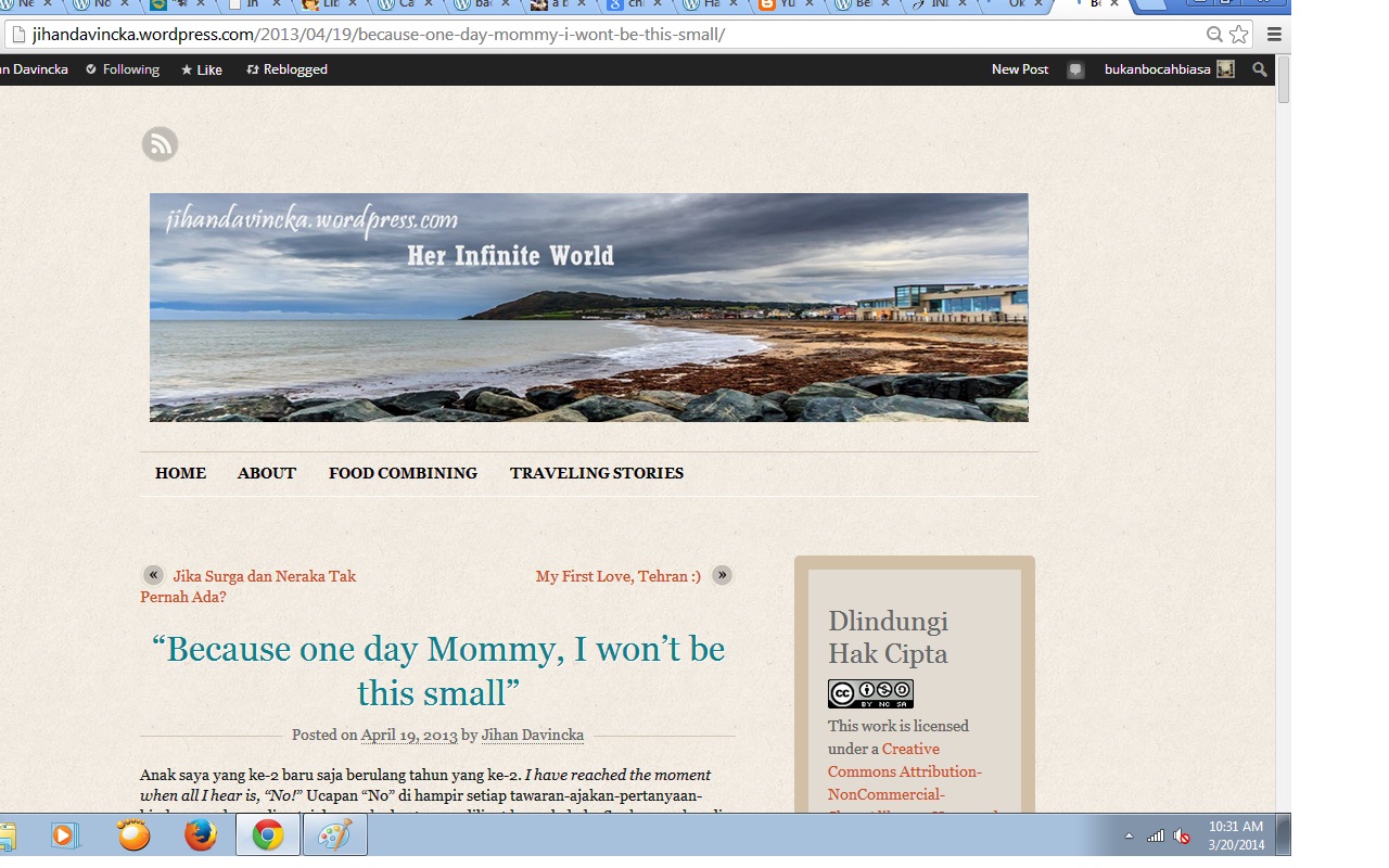 “Kenal” ama jeung Jihan ini, gara-gara baca tulisan “Because one day Mommy, I won’t be this small” di website Urban Mama. Ajib banget nih artikel. Aku bacanya sampe mewek kejer! Sedih, syahdu, nampolll abis. Trus, mulai ketagihan deh, buat SETIAP hari klik blog emak cantik ini di http://jihandavincka.wordpress.com/.