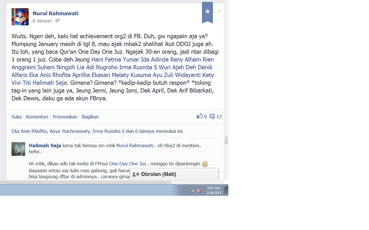 Status 8 Jan: Ngajak ODOJ teman-teman muslimah di kantor