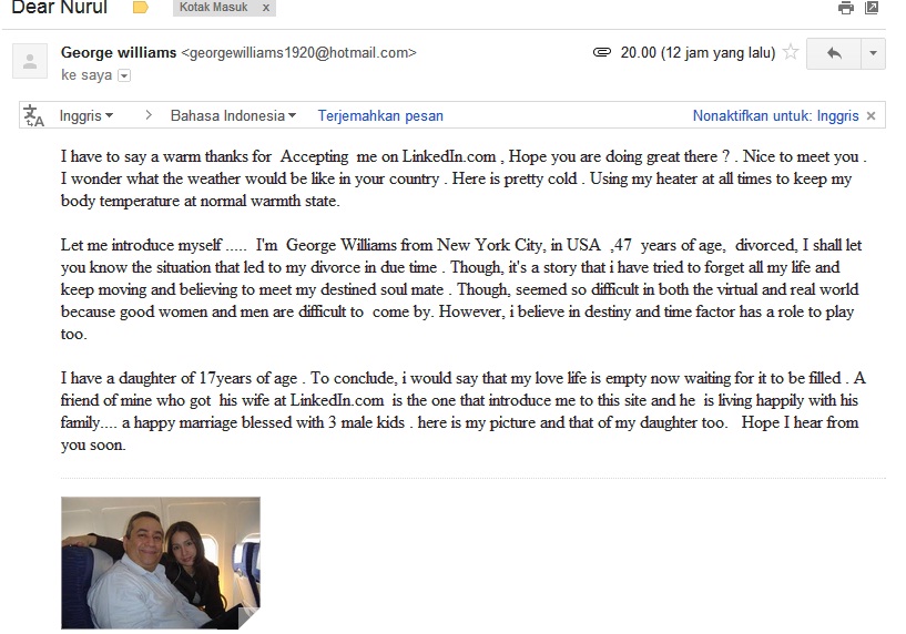 5. Di sosmed banyak bule yg komen2 beginian ya. Klo aku terima email2 seperti itu nggak pernah kubales, langsung delete saja. Paling sering dapet itu di myspace dulu, padahal foto profileku foto bareng sekeluarga.