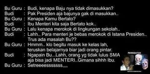 25. untuk mengingatkan ibu mentri susi masalah merokok saya setuju dgn artikel yg dibuat emak satu ini ..saya sendiri tdk merokok dan tdk suka melihat org merokok sembarangan apalagi beliau panutan anak anak bangsa.artikel yg bagus namun ga perlulah dibumbui kata kata GARIS KERAS di postingan komen & gak perlu ditambahin soal blow up rapot merah kalau niat mau membantu atau mendoakan bu mentri berubah cukup dgn mengingatkan yg baik insyaallah bu mentri mengerti kok ..saya kemarin liat di tv bahkan di media social klo bu susi minta masukannya cara dia berpenampilan beliau trima kok kritikan.. manusia pasti punya khilaf tapi ga perlu berkepanjangan beliau udah dengar.. beliau skr minta dukungan untuk program” yg beliau hrs kerjakan untuk kemajuan bangsa bukan hanya berenti di satu titik kritikan perkepanjangan… ok emak selamat yaa 🙂