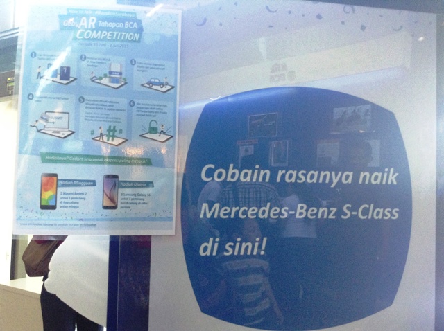 Eh sekadar info ya, BCA bikin wahana keren augmented reality (AR). Wahana ini disediakan untuk mendukung kemeriahan Gebyar Tahapan BCA (GTB) 2015. Di situ BCA mengajak seluruh nasabahnya untuk merasakan sensasi mengendarai  Grand Prize Mercedes-Benz. Mommies bisa bergaya dan berpose di atasnya dengan gaya selebrasi seunik dan semenarik mungkin. Setelah itu, hasil foto atau videonya bisa langsung di-share ke Facebook dan Twitter dengan hastag #RayakanMomen beserta #RayakanSurabaya (kan aku tinggal di Surabaya) terus mention ke @GoodLifeBCA. Selain di Surabaya, mesin AR yang canggih ini hadir pula di Bandung, Medan, Palembang, Semarang, Kediri, Makassar, dan Samarinda