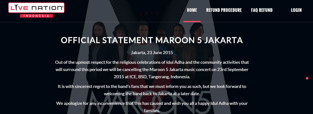 Daaaan, ternyata oh ternyata, dalam akun twitternya, Maroon 5 menyatakan konser yang bakal digelar di BSD City itu DIBATALKAN, sodara-sodara. Hiksss banget yak? Eniwei, alasan yang dipake adalah, karena konser itu diselenggarakan pada malam takbiran jelang Idul Adha. Jadi, tim Maroon 5 pengin menghormati Hari Raya umat Islam itu.