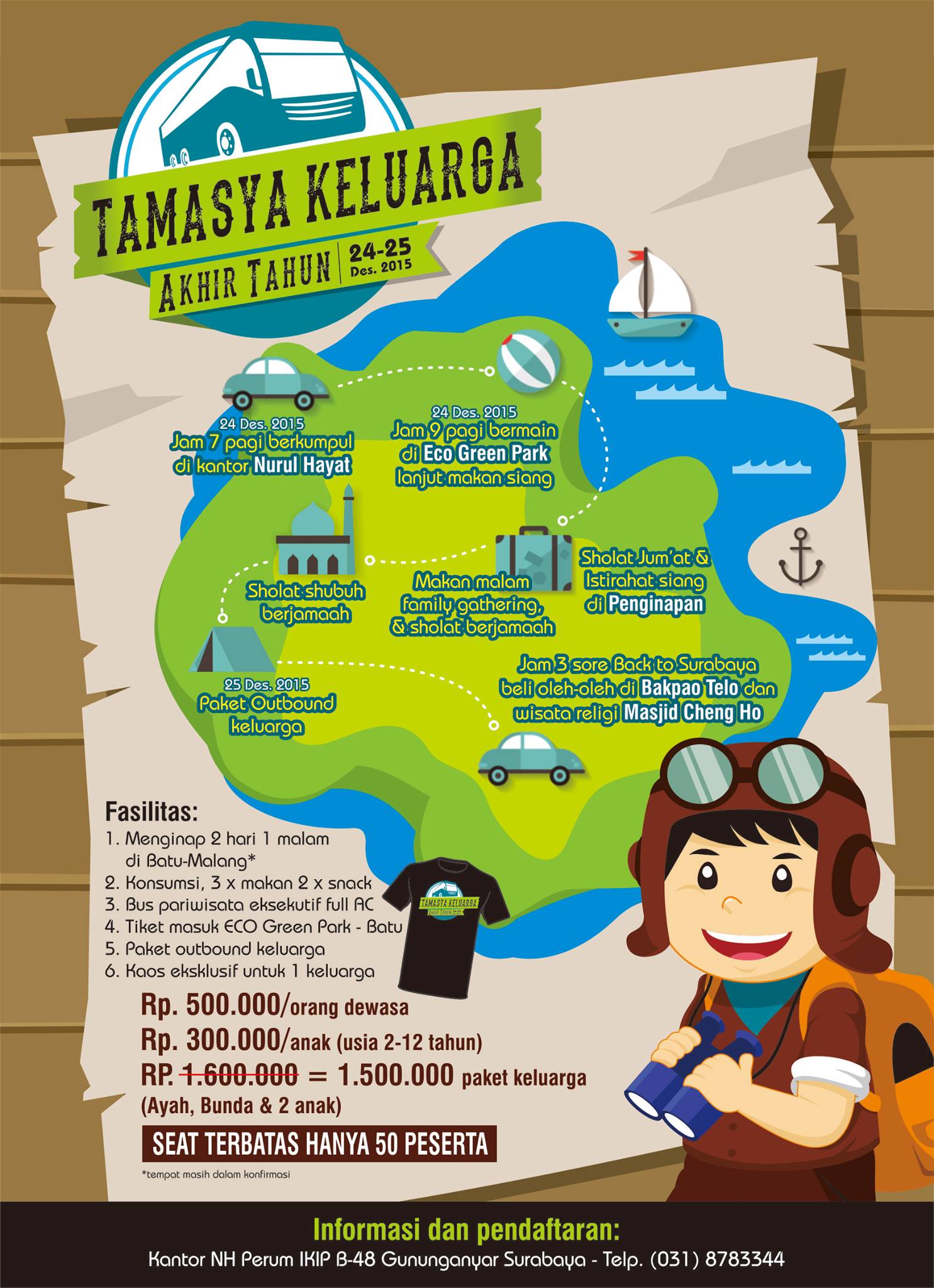 Jadi ceritanya, teman-teman saya tuh bikin program Tamasya Keluarga. Budgetnya enggak terlalu mehong kok. Untuk anak-anak (usia 2 sampai 12 tahun) cuma dipatok angka 300K sajah. Bokap-nyokap bolelebo kalo mau ikutan. Tarifnya 500K. Eh, ada paket famili pulak 🙂