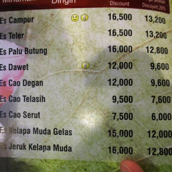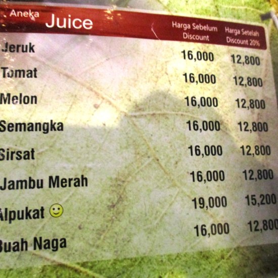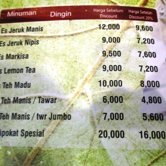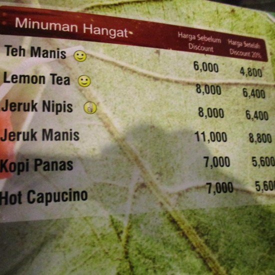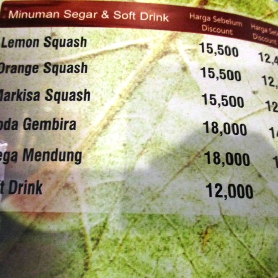 Karena sohib-sohib (seperti sudah diduga) datang ngareeeettt banget, dan saya udah mati gaya nunggu selama SATU JAM AJAH GITUH sodara-sodara, saya pun motretin menu-menu yang terpampang. Juga nyaris khatam baca Al-Qur’an satu juz *yang ini sih bo’ong banget*