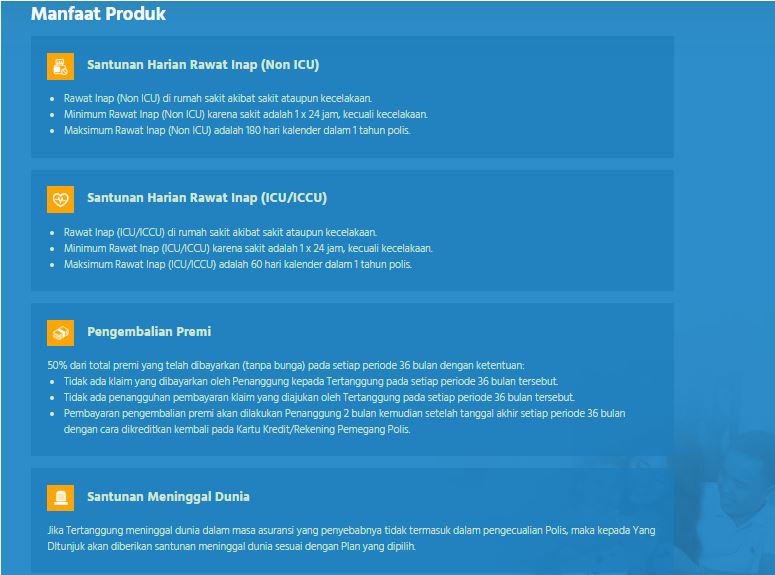 Asuransi Rawat Inap ini menyediakan manfaat bagi pemegang Polis Asuransi yang lengkap yaitu manfaat Santunan Harian Rawat Inap, No Claim Bonus, dan Santunan Meninggal Dunia.