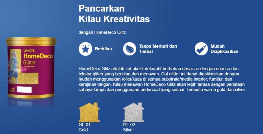 Ada dua varian warna HomeDeco Glitz yaitu gold dan silver dan  dapat diaplikasikan dengan mudah menggunakan roller atau kuas. Tak perlu kuatir karena bebas timbal dan merkuri, tahan lama serta ramah lingkungan. Oh ya, produk cat glitter ini juga bisa di aplikasikan ke semua media interior, furnitur maupun kerajinan tangan.
