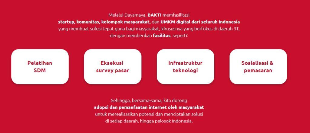 Melalui peran startup, komunitas, dan UMKM yang terlibat, kami harapkan dapat mempercepat kemajuan di daerah 3T. Saat ini sudah ada lima inisiatif, dari 18 yang terpilih pada tahun 2019, yang mulai berproses di masyarakat. Kami yakin dengan peran serta mereka, akan segera terjadi perubahan di daerah 3T menuju ke arah yang lebih baik,” tutur Danny Januari Ismawan, Direktur Layanan TI untuk Masyarakat dan Pemerintah. Dayamaya memiliki visi untuk mendukung pengembangan ekosistem ekonomi digital Indonesia, khususnya di daerah 3T (terluar, tertinggal, terdepan) dengan semangat gotong royong bersama para stakeholder strategis bagi kesejahteraan masyarakat.
