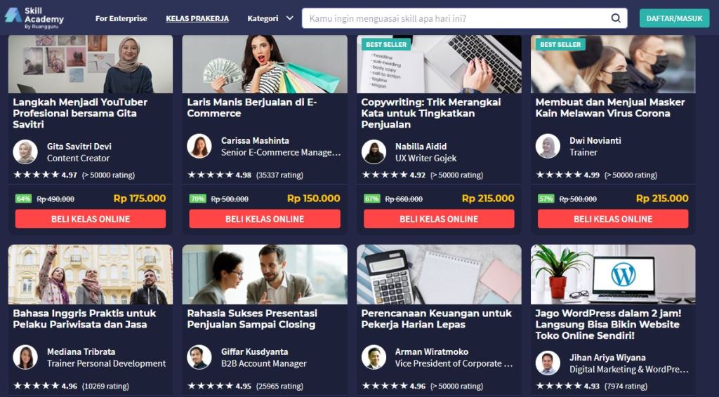 33. Sekarang zamannya belajar online ya mbk. Semuanya serba online, mulai belajar, seminar sampai pelkatihan. Kapan hari lihat dan buka buka Skill Academy, banyak banget pilihannya ya