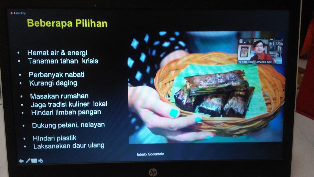 “Tetapi, pangan juga merupakan solusi dari krisis iklim. Seperti dua sisi dari mata uang. Bagaimana cara kita memproduksi pangan maupun cara konsumsi pangan sangat mempengaruhi krisis iklim,” ujar Bu Amanda Katili Niode dari Climate Reality Indonesia.Karena itulah, Bu Amanda menggarisbawahi pentingnya makanan ramah iklim.