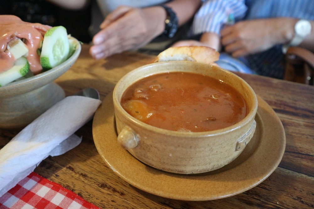 Lokasinya nggak terlalu jauh (kalo naik mobil). Kami datang ke Resto yang di kawasan Setiabudi, Bandung. Kalo dilihat dari bentukan resto, kelihatan jadul gitu. Ala-ala resto zaman Belanda 😊 Di Malang, mirip Resto OEN gitu vibes-nya. Yang bikin makin old-school lagi, karena taplak yang dipakai bentuk kotak-kotak merah putih, aduhaaii entah kenapa kok saya berasa kelempar ke jaman kolonialisme dan imperialisme. Hihihi. Berasa lagi belajar materi Sejarah di Blog Homeschooling dah