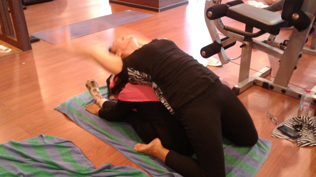 Mbak pengajar yoga juga mengajarkan kami untuk saling menopang bodi peserta satu sama lain. Hahaha, agak ngeri ngeri syedaappp sih, Hamdalah we nailed it!