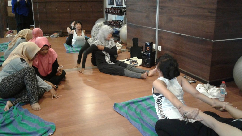 Kami diminta untuk mengenakan pakaian berbahan katun yang nyaman. Pastinya supaya kalo gerak “aneh-aneh” gitu, bodi kami bisa beradaptasi dengan baik, juga supaya menyerap keringat kan. Hahaha, kebayang kalo olahraga berleleran keringat, trus bahan kaosnya malah yang menguarkan aroma, hadehhh auto-pingsan ntar 😊