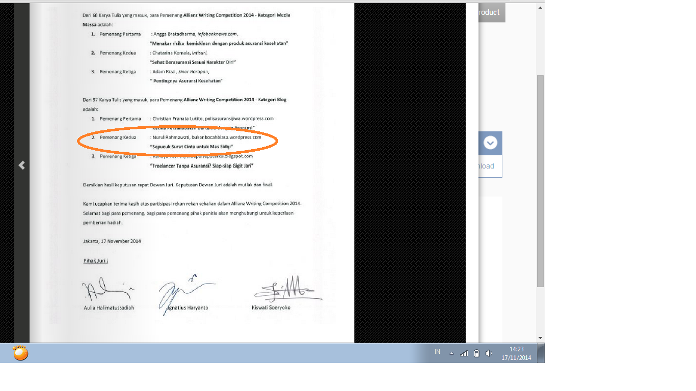 Pengumuman pemenang di sini –> http://www.allianz.co.id/allianz-writing-competition-2014.php